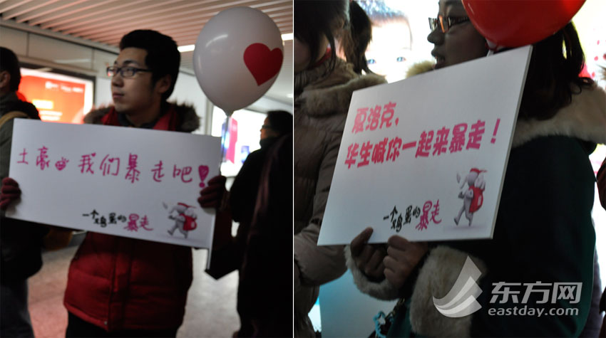 帅哥妹子举牌引领“暴走”。