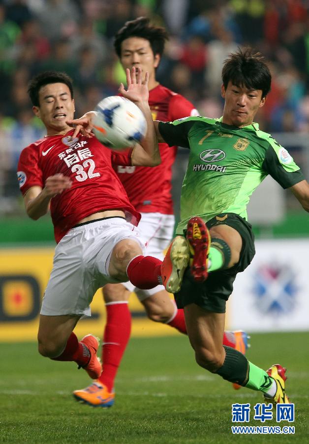 4月2日,广州恒大队球员孙祥(左)与全北现代队球员韩教元在比赛中拼抢。当日,在2014亚冠联赛G组第四轮比赛中,中国广州恒大队客场以0比1不敌韩国全北现代队。