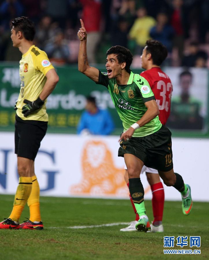 4月2日,全北现代队球员莱昂纳多(中)在比赛中庆祝进球。