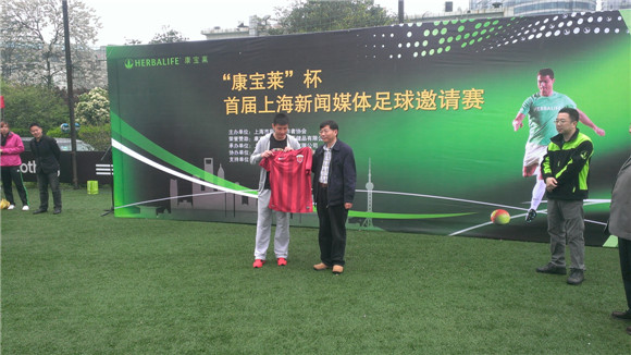4月13日,由上海市新闻工作者协会主办的“康宝莱杯”首届上海新闻媒体足球邀请赛开幕式在上海体育场足球公园举行。上海市足协秘书长隋国阳、著名足球运动员武磊等嘉宾开幕式现场助阵。媒体记者放下手中笔杆子投入到富有激情的比赛中去,在绿茵场上展开热血的拼杀。赛事将为期一个月。图为武磊捐赠球衣。