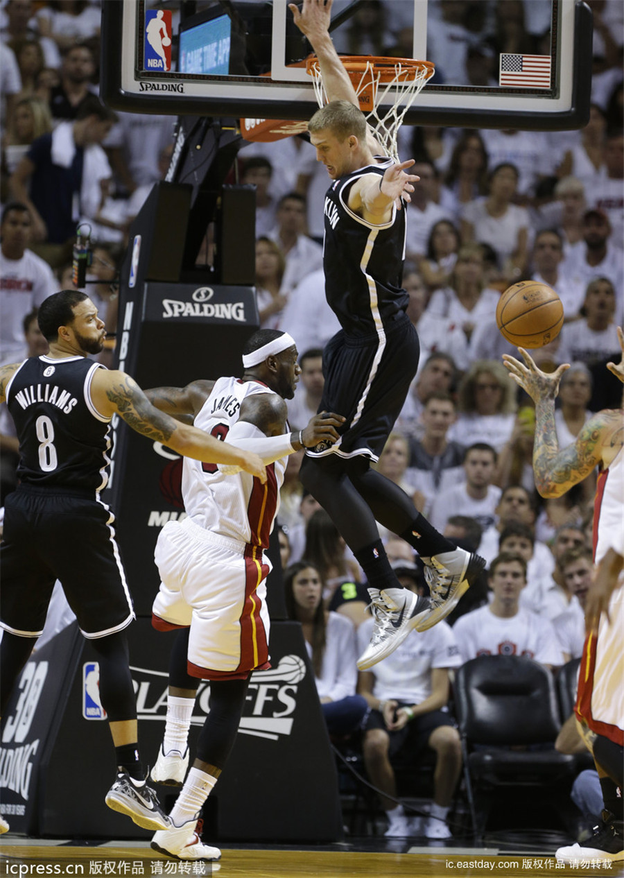 当地时间2014年5月6日,美国迈阿密,13/14赛季NBA季后赛东部半决赛第1场,篮网86-107热火。热火数据:勒布朗-詹姆斯拿到22分5个篮板、德维恩-韦德14分5次助攻4个篮板、克里斯-博士15分11个篮板、马里奥-钱莫斯12分2次助攻、替补雷-阿伦19分4个篮板3次助攻。篮网数据:德隆-威廉姆斯17分3次助攻3个篮板、乔-约翰逊17分4个篮板2次助攻、保罗-皮尔斯8分6个篮板、替补马库斯-索顿11分1个篮板。(图片来源:东方IC)