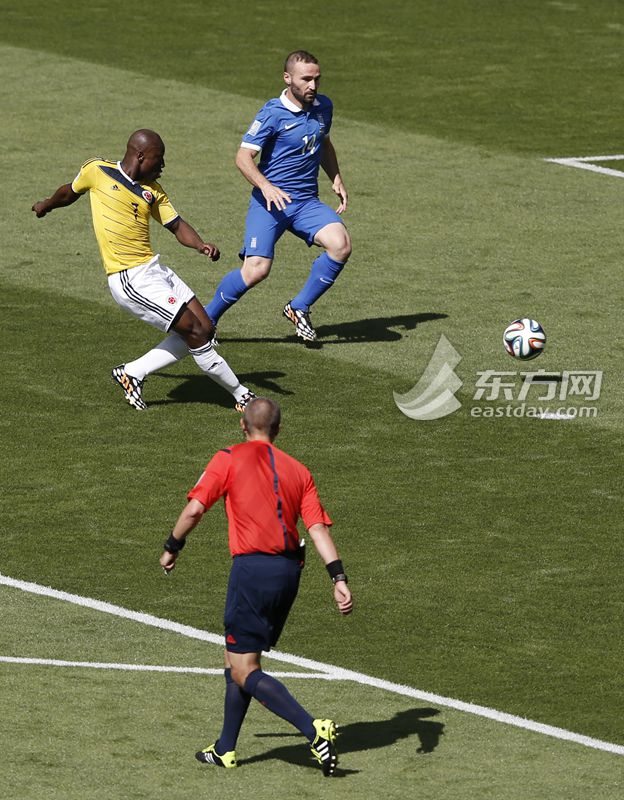 北京时间6月15日0点,巴西世界杯C组小组赛首轮第一场比赛开战,开场后不久,哥伦比亚阿梅罗进球。>>>>点击进入2014巴西世界杯专题