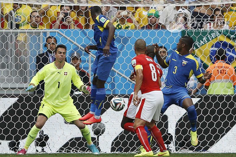 北京时间6月16日凌晨0点(巴西当地时间下午13点),2014巴西世界杯E组比赛瑞士与厄瓜多尔在巴西利亚的巴西国家体育场展开首场比赛争夺。 图为22分时厄瓜多尔巴伦西亚头球破门。 >>>>点击进入2014巴西世界杯专题