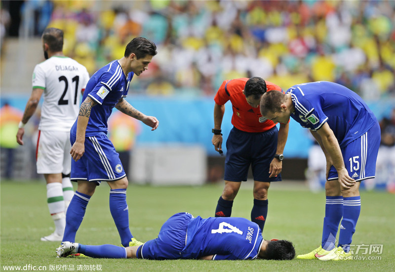 这支世界杯新军显然还不懂得改如何“受伤”,他们总共只有2次“装病”,总时长为24秒,这或许也是他们出局的原因之一吧。当地时间2014年6月25日,萨尔瓦多新水源球场,2014巴西世界杯小组赛F组,波黑3-1伊朗。(来源:东方IC 未经许可不得转载)