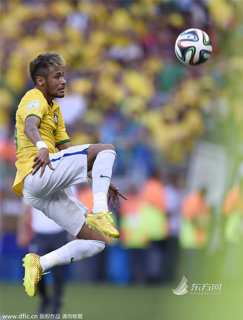 当地时间2014年6月28日,贝洛奥里藏特米内朗球场,2014巴西世界杯1/8决赛,巴西1-1智利。内马尔穿着金色毒蜂。(来源:东方IC 未经许可不得转载) >>>点击进入2014巴西世界杯专题