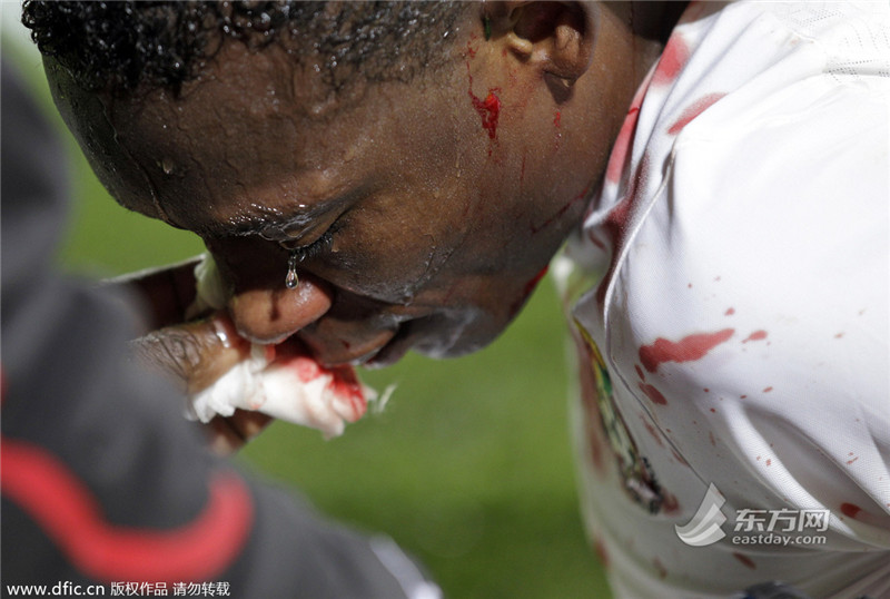 当地时间2010年6月19日,南非勒斯滕堡,2010年南非世界杯小组赛,加纳1-1澳大利亚队。加纳队潘特希尔受伤流血。(来源:东方IC 未经许可不得转载) >>>点击进入2014巴西世界杯专题