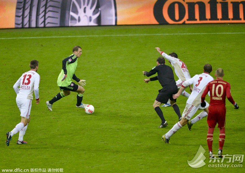 当地时间2012年10月28日,12/13赛季德甲第9轮,拜仁1-2勒沃库森。诺伊尔冲出禁区盘带。(来源:东方IC 未经许可不得转载) >>>点击进入2014世界杯专题页面
