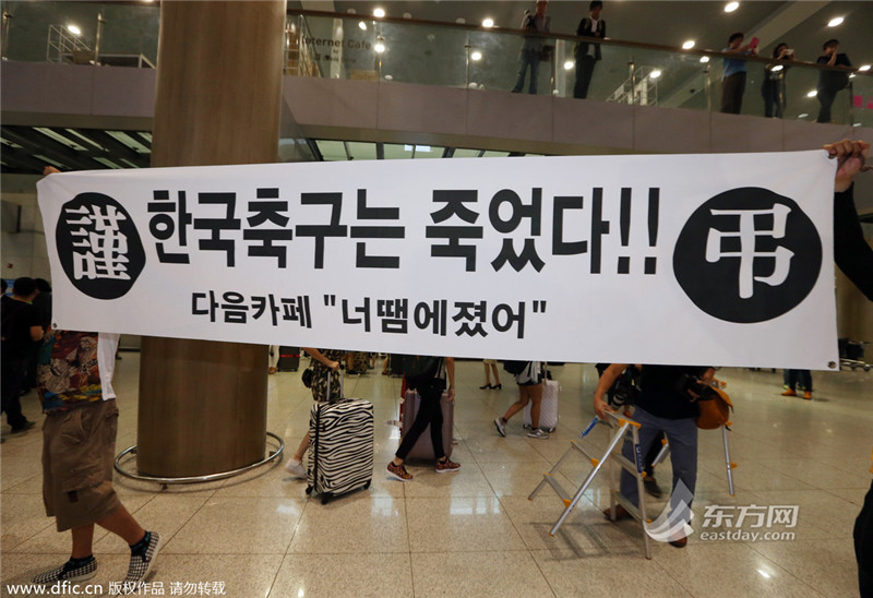 当地时间2014年6月30日,韩国首尔,韩国队飞抵仁川机场。球迷举着“韩国足球已死”的标语讽刺太极虎将士。(来源:东方IC 未经许可不得转载) >>>点击进入2014世界杯专题页面