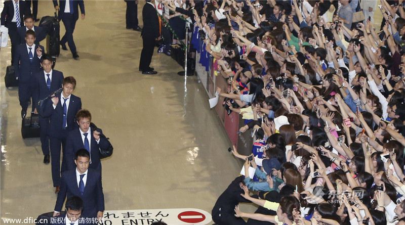 当地时间2014年6月27日,东京成田机场,在世界杯上一场不胜小组淘汰的日本队回国。数千痴心球仍迷机场迎接。(来源:东方IC 未经许可不得转载) >>>点击进入2014世界杯专题页面