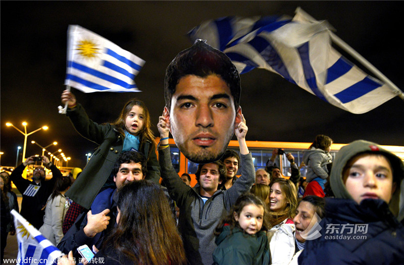 当地时间2014年6月26日,乌拉圭卡拉斯科机场,在国际足联作出处罚决定后,苏亚雷斯离开了世界杯,离开了队友,独自返回乌拉圭。但乌拉圭的球迷们永远和他在一起,苏亚雷斯预计会受到英雄般的欢迎。在机场,数千人守候等待苏神的到来。(来源:东方IC 未经许可不得转载) >>>点击进入2014世界杯专题页面