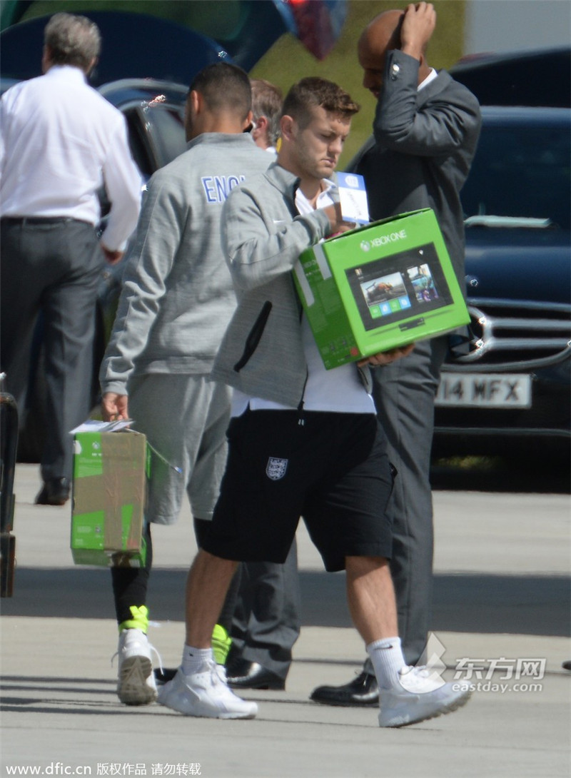 当地时间2014年6月25日,英国伦敦,英格兰队飞抵伦敦卢顿机场,英格兰队抵达。阿森纳球星威尔希尔和张伯伦带着各自在巴西购买的XBox游戏机回家。(来源:东方IC 未经许可不得转载) >>>点击进入2014世界杯专题页面