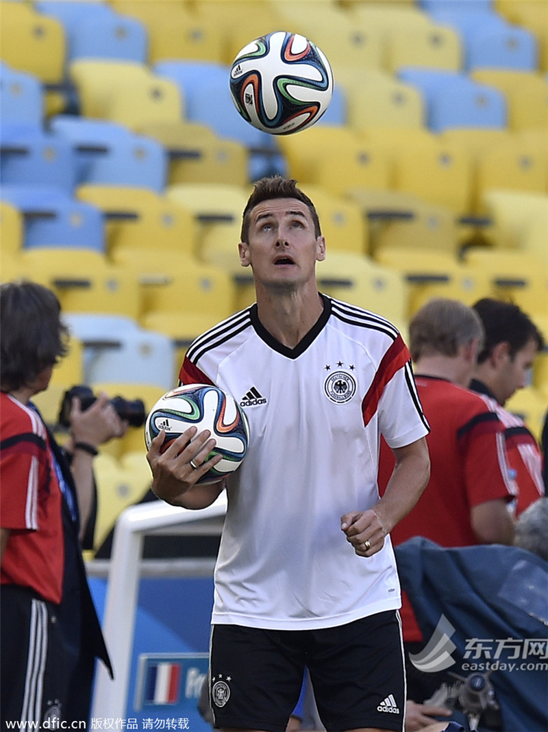 当地时间2014年7月3日,巴西里约热内卢,2014巴西世界杯1/4决赛前瞻,德国队训练。训练场气氛轻松,德国队员甚至拿足球当篮球玩,PK投篮技术。(未经许可不得转载)