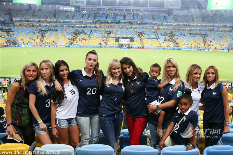 德国太太团阵容庞大,德国球星厄齐尔女友曼迪-卡普里西托、德国球星赫迪拉女友莲娜-格尔克等都是姿色过人,反观法国太太团的质量就略显不足,萨尼亚妻子卢蒂文-萨尼亚算是一枝独秀。左起:雷米妻子,卡巴耶妻子,萨科妻子,萨尼亚妻子,埃弗拉妻子。当地时间2014年6月25日,里约热内卢马拉卡纳大球场,2014巴西世界杯小组赛E组,厄瓜多尔0-0法国。