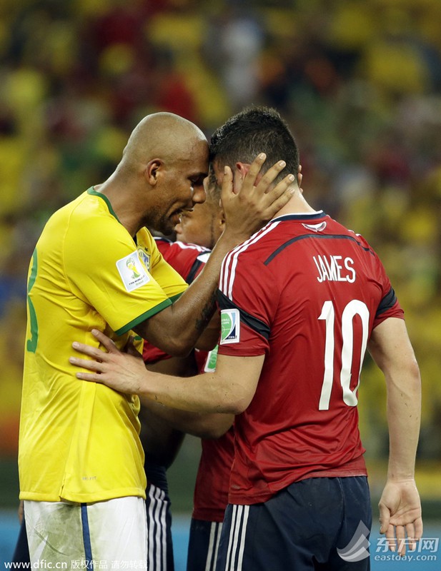 巴西世界杯1/4决赛,巴西2-1哥伦比亚进四强将遭遇德国战车。赛后哥伦比亚新星J罗德里格斯伤心落泪,英雄惜英雄,巴西众将也送上了安慰和拥抱。图为巴西队老将麦孔安慰J罗。(来源:东方IC 未经许可不得转载)>>>点击进入2014年巴西世界杯专题
