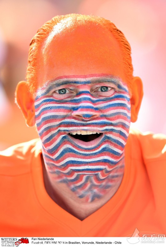 2014巴西世界杯半决赛即将打响,巴西、德国、阿根廷和荷兰的球迷也是赛场上最活跃的因素,他们喜欢用五颜六色的颜料将自己的脸涂满为球队助威。图为荷兰著名球迷“条纹叔”。(来源:东方IC 未经许可不得转载)>>>点击进入2014年巴西世界杯专题