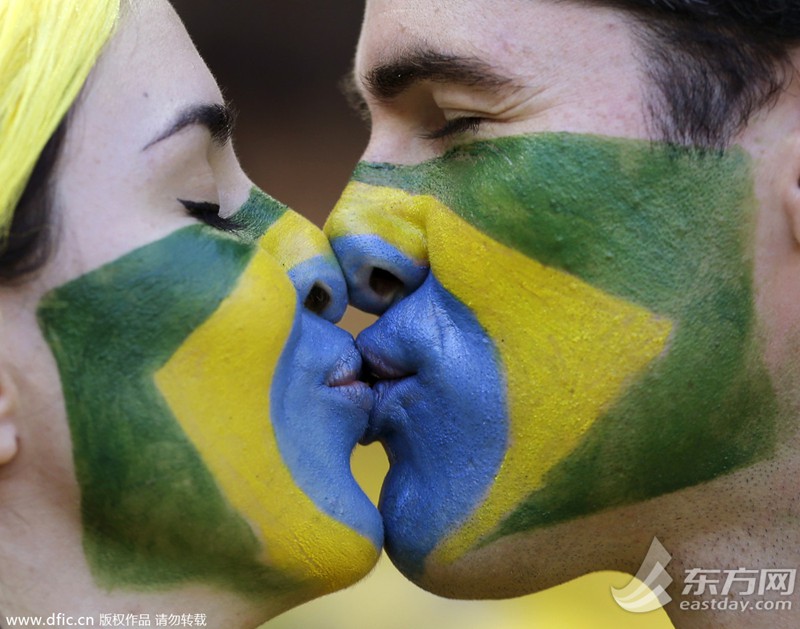 2014巴西世界杯半决赛即将打响,巴西、德国、阿根廷和荷兰的球迷也是赛场上最活跃的因素,他们喜欢用五颜六色的颜料将自己的脸涂满为球队助威。图为一对巴西情侣绘制出国旗连体彩绘,在亲吻时刚好拼出巴西国旗的造型。(来源:东方IC 未经许可不得转载)>>>点击进入2014年巴西世界杯专题