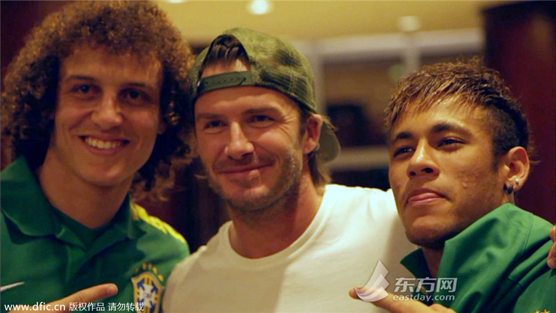 近日,巴西国家对造访迈阿密的DVD正式发售,内马尔和大卫-路易斯两位国脚与贝克汉姆亲切合影,两绿一白的衣服配色好似夹心三明治。(来源:东方IC 未经许可不得转载) >>>点击进入2014世界杯专题页面