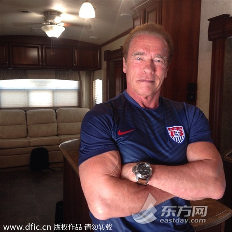 近日,美国著名男星、前健美冠军施瓦辛格穿美国球衣助阵,猛男深信美国进八强。(来源:东方IC 未经许可不得转载) >>>点击进入2014世界杯专题页面