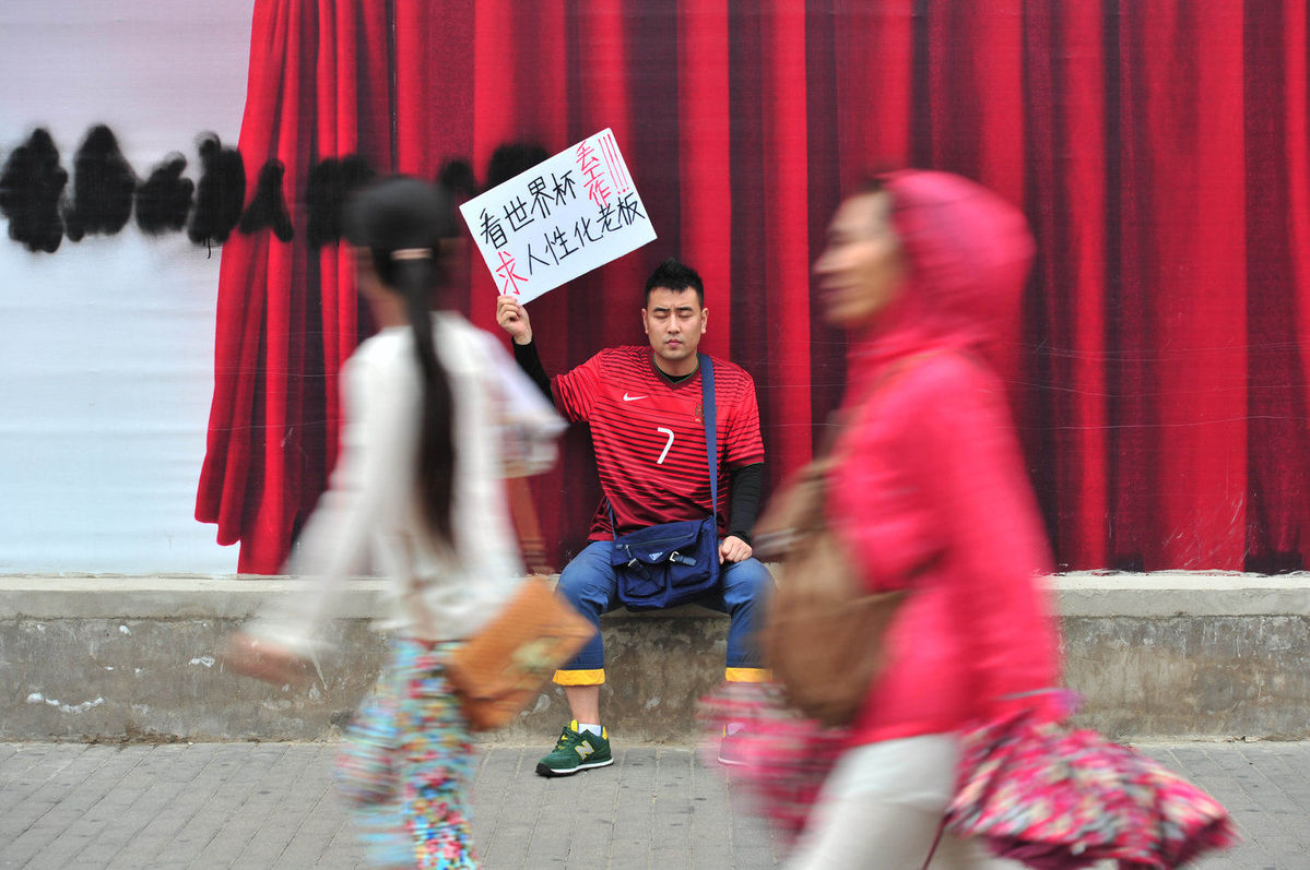 2014年6月25日,北京,在地铁崇文门d出口男子因看世界杯丢工作,身穿C罗球衣,坐在街头求职,求职牌子举过头顶。