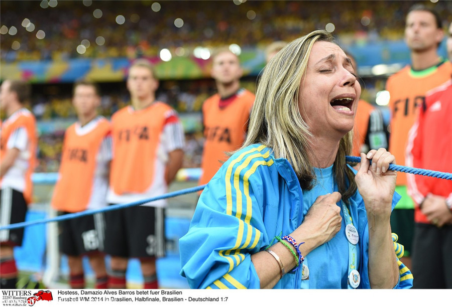 当地时间2014年7月8日,贝洛奥里藏特米内朗体育场,2014巴西世界杯半决赛,巴西1-7德国。赛后一位巴西礼仪小姐在场边放声痛哭。(来源:东方IC 未经许可不得转载)>>>点击进入2014巴西世界杯专题