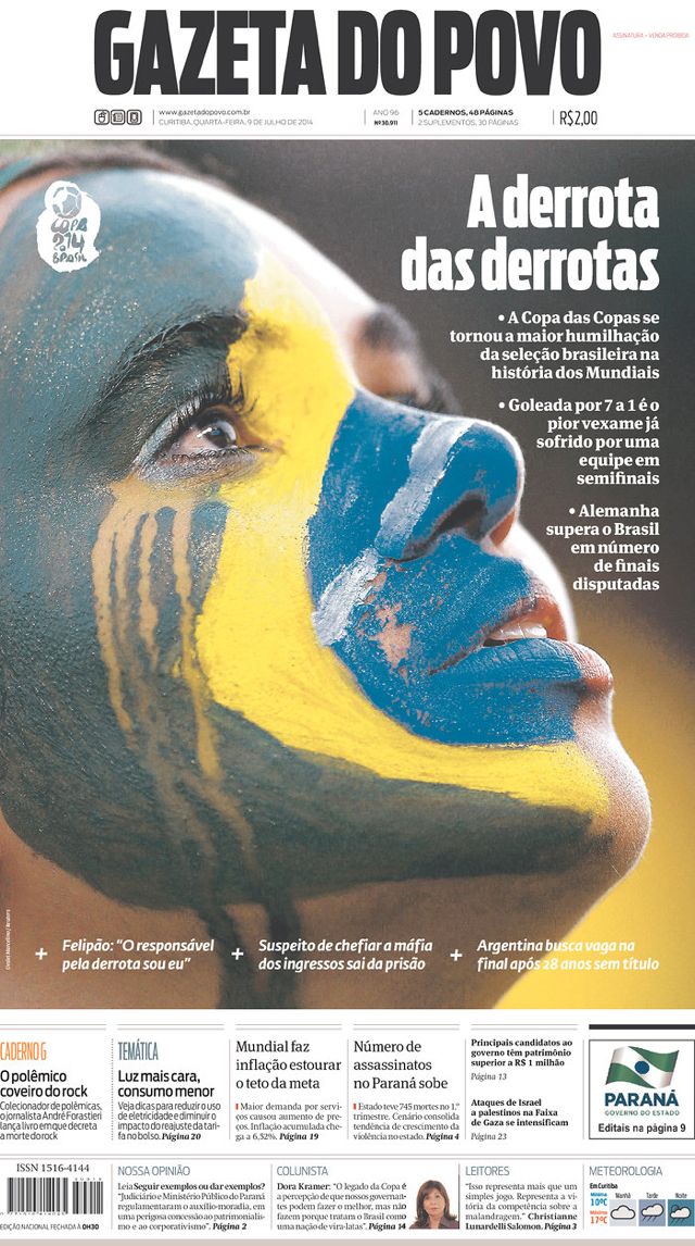 “失败中的失败”。昨天凌晨巴西1:7输给德国队后,16份巴西主要报纸的头版是如何报道的?看看吧,桑巴军团六星梦陨、耻辱、屠杀……还有,还有什么也没的,主编看来已经无语了。 >>>>点击进入2014巴西世界杯专题