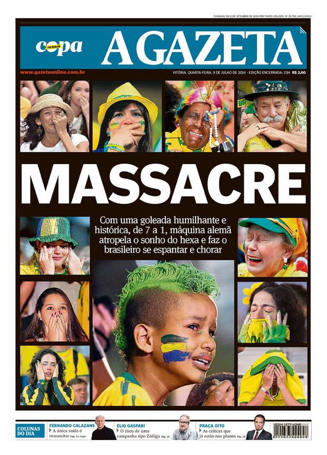 “大屠杀”。昨天凌晨巴西1:7输给德国队后,16份巴西主要报纸的头版是如何报道的?看看吧,桑巴军团六星梦陨、耻辱、屠杀……还有,还有什么也没的,主编看来已经无语了。 >>>>点击进入2014巴西世界杯专题