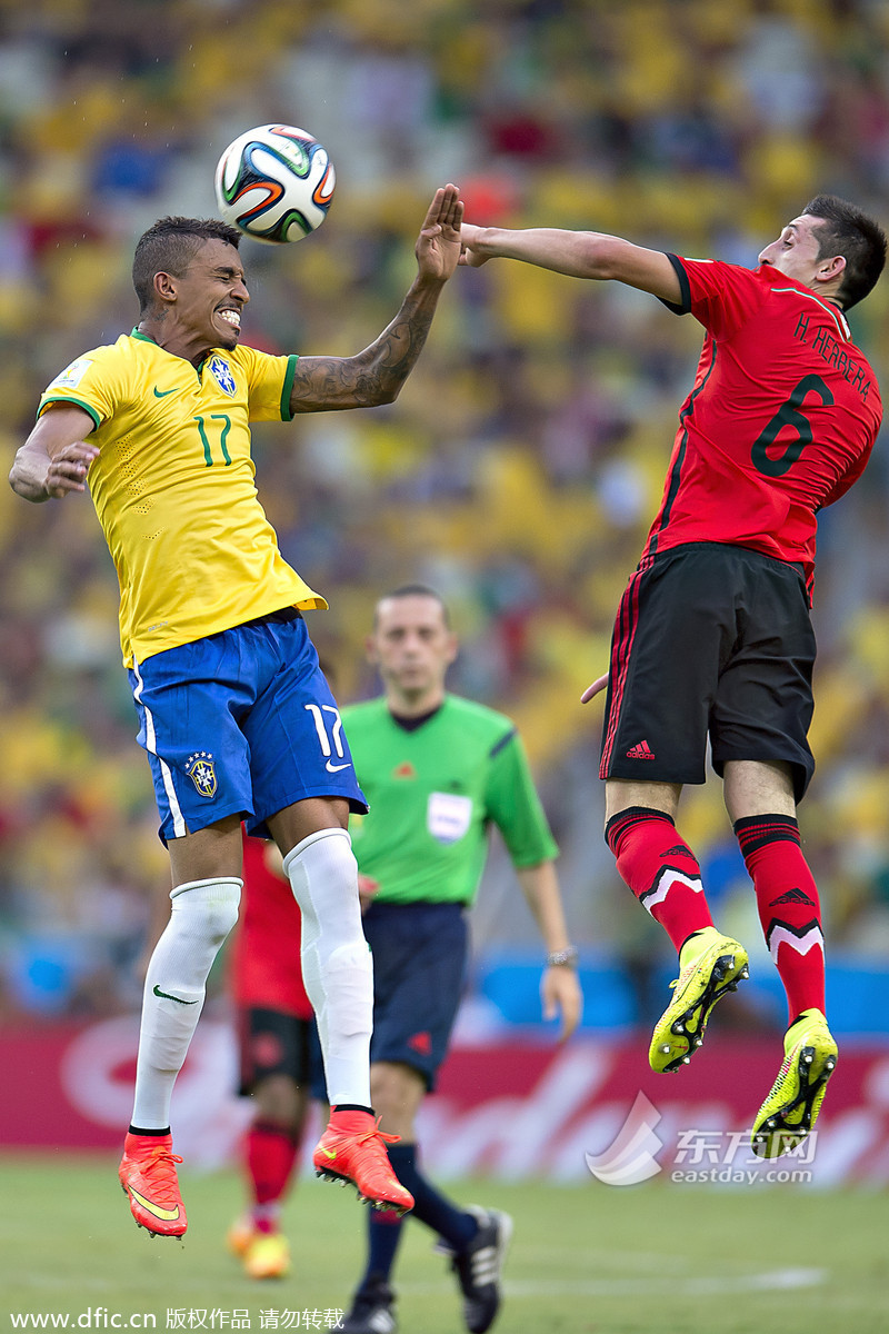 拳VS掌。当地时间2014年6月17日,福塔雷萨卡斯特朗体育场,2014巴西世界杯小组赛A组,巴西0-0墨西哥。(来源:东方IC 未经许可不得转载)>>>点击进入2014年巴西世界杯专题