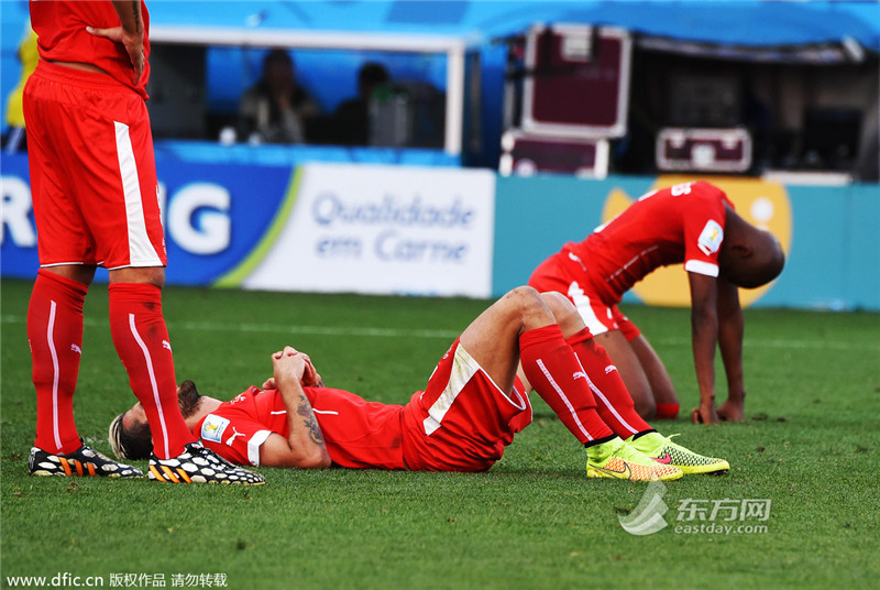 当地时间2014年7月1日,圣保罗科林蒂安体育场,2014巴西世界杯1/8决赛,阿根廷1-0瑞士。失落的瑞士球员一跪一躺,形成错位。 (来源:东方IC 未经许可不得转载)>>>点击进入2014年巴西世界杯专题