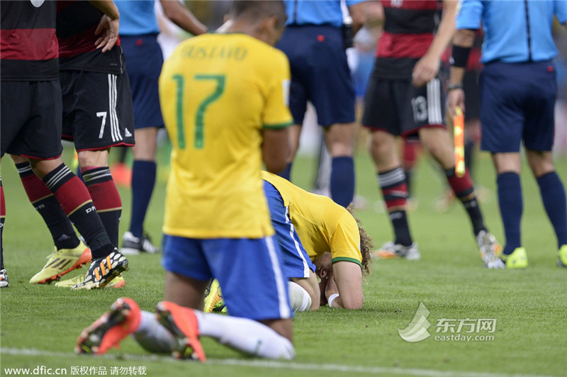 当地时间2014年7月8日,贝洛奥里藏特米内朗体育场,2014巴西世界杯半决赛,巴西1-7德国。巴西球员失落,一前一后,一跪一趴,让人浮想联翩。(来源:东方IC 未经许可不得转载)>>>点击进入2014年巴西世界杯专题