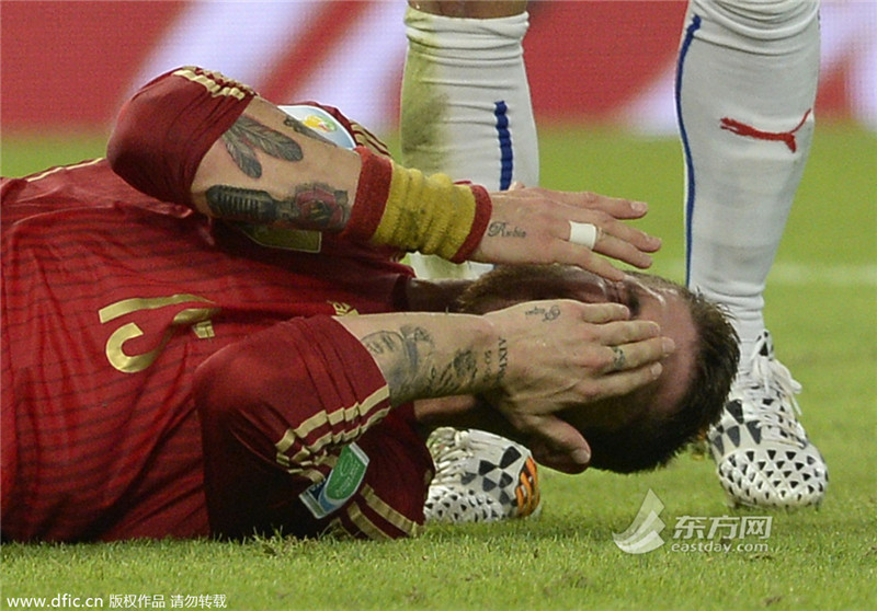 影帝非我莫属当地时间2014年6月18日,里约热内卢马拉卡纳大球场,2014巴西世界杯小组赛B组,西班牙0-2智利。拉莫斯遭踢脸侵犯倒地假装捂脸。(来源:东方IC 未经许可不得转载)>>>点击进入2014年巴西世界杯专题