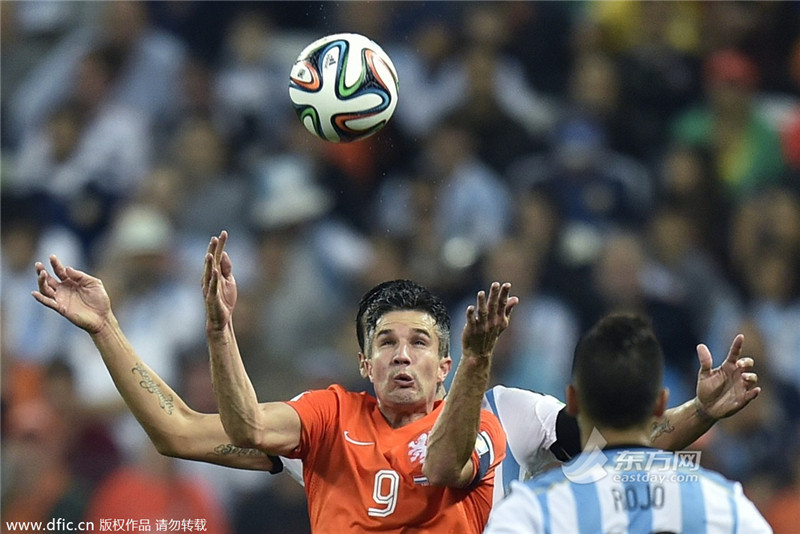 当地时间2014年7月9日,圣保罗科林蒂安体育场,2014巴西世界杯半决赛,荷兰0-0阿根廷。范佩西与身后的阿根廷球员的胳膊形成错位。(来源:东方IC 未经许可不得转载)>>>点击进入2014年巴西世界杯专题