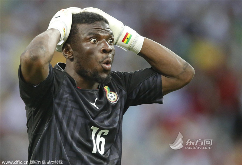 my god!加纳门将惊讶的表情。(来源:东方IC 未经许可不得转载)>>>点击进入2014年巴西世界杯专题