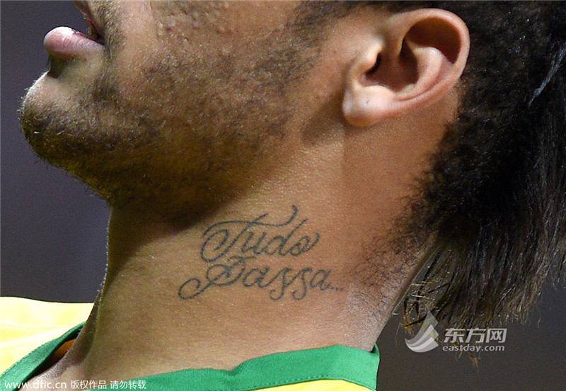 内马尔的脖子部位有一处颇具有哲学意味的文身,特别符合球员在1-7不敌德国队的心境。“Tudo Passa”翻译过来是“一切都会过去”或者“世事无永恒”的意思。另外,他在腿上也有文身“Ousadia”and“Alegria”,意思分别为“胆量”和“快乐”,这两个文身是他在去年加盟巴萨之前文的。(来源:东方IC 未经许可不得转载) >>>点击进入2014世界杯专题页面