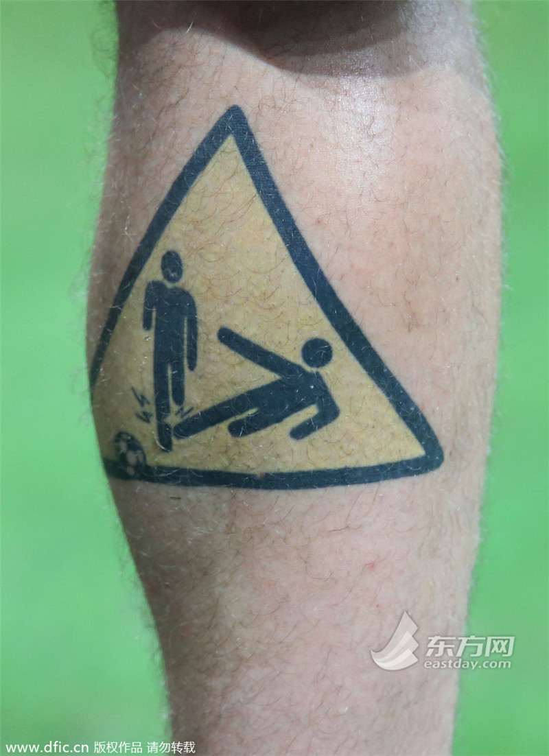 以硬汉形象著称的德罗西球风硬朗,他在巴西世界杯前就在右小腿上文了一个“当心被铲”的三角形图案。文身中被铲球员的腿部有一处“缺口”,此文身提醒球员们比赛中一定要戴上护腿板。(来源:东方IC 未经许可不得转载) >>>点击进入2014世界杯专题页面