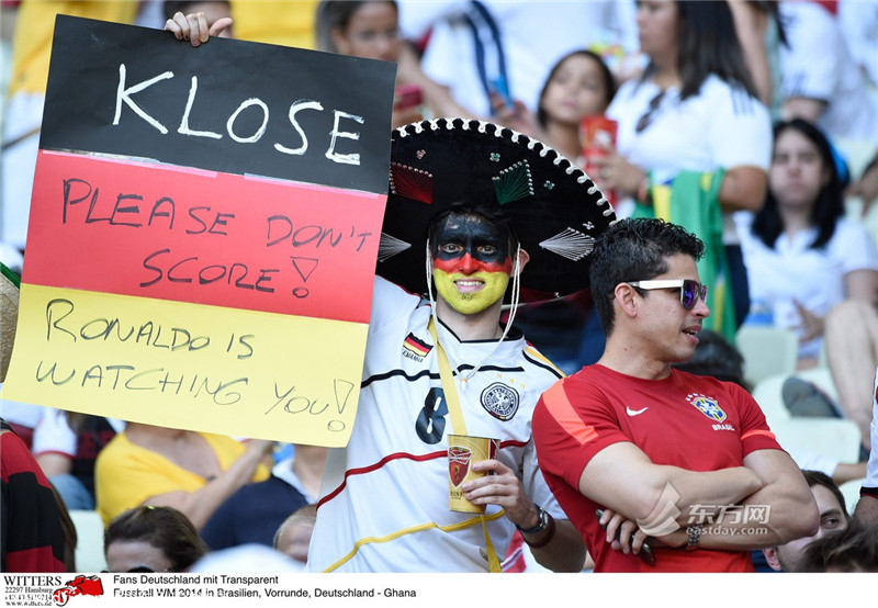 当地时间2014年6月21日,福塔雷萨卡斯特朗体育场,2014巴西世界杯小组赛G组,德国2-2加纳。球迷打出标语:克洛泽不要进球,罗纳尔多在看着你。(来源:东方IC 未经许可不得转载)>>>点击进入2014年巴西世界杯专题