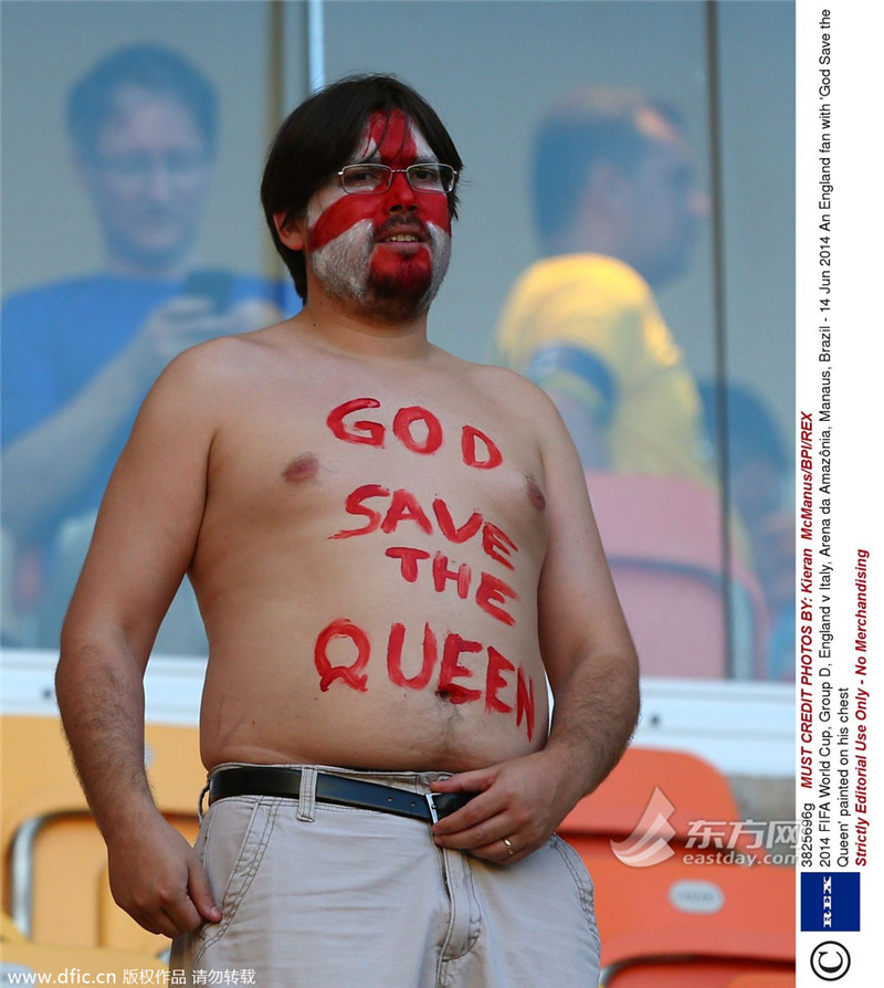 当地时间2014年6月14日,玛瑙斯亚马逊竞技场,2014巴西世界杯小组赛D组,英格兰1-2意大利。英格兰在身上彩绘出“上帝可以拯救英格兰”的标语。(来源:东方IC 未经许可不得转载)>>>点击进入2014年巴西世界杯专题