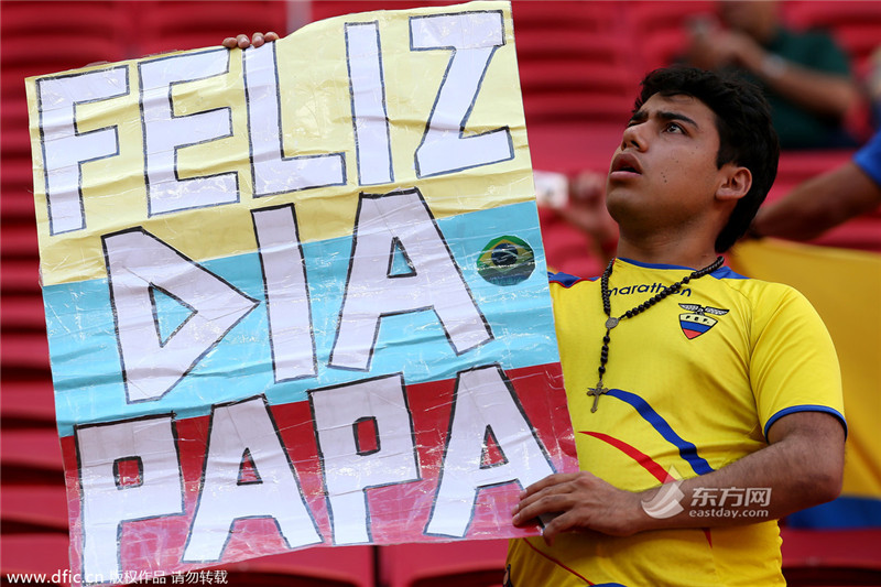 当地时间2014年6月15日,巴西利亚国家体育场,2014巴西世界杯小组赛E组,瑞士2-1厄瓜多尔。正直父亲节,球迷打出“节日快乐,爸爸”的标语。(来源:东方IC 未经许可不得转载)>>>点击进入2014年巴西世界杯专题