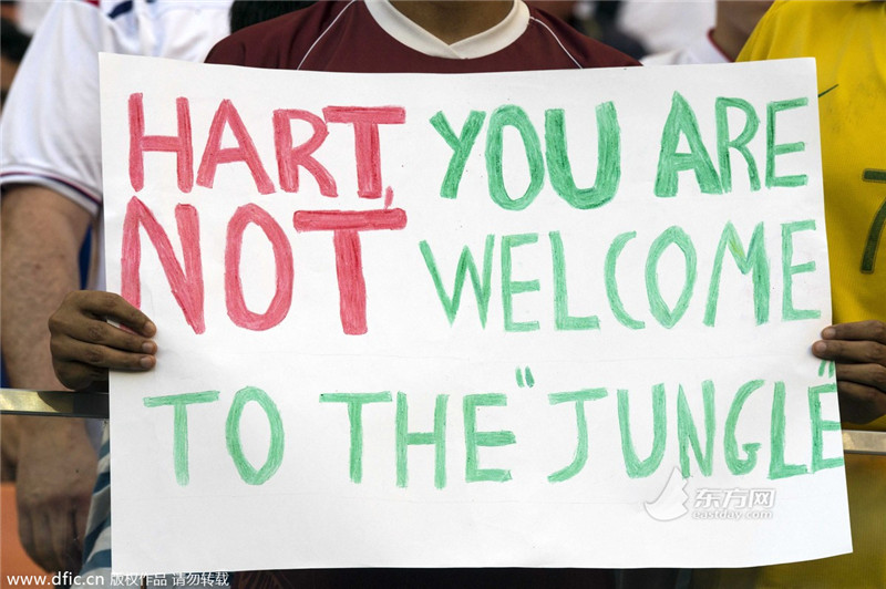 当地时间2014年6月14日,玛瑙斯亚马逊竞技场,2014巴西世界杯小组赛D组,英格兰1-2意大利。意大利球迷打出了“乔-哈特,丛林(代表巴西)不欢迎你”的标语。(来源:东方IC 未经许可不得转载)>>>点击进入2014年巴西世界杯专题