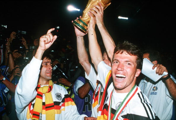 1990意大利世界杯。西德1-0战胜阿根廷夺冠。德国队长马特乌斯高举大力神杯。>>>>点击进入2014巴西世界杯专题页面