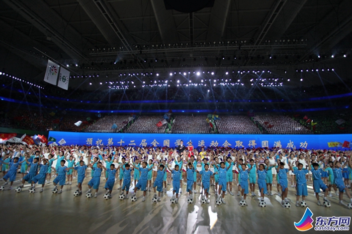 2014年7月28日晚的黄浦江畔,见证了一场青春的聚会。当晚,中华人民共和国第十二届学生运动会开幕式在上海东方体育中心精彩上演。一张张热情洋溢的脸庞、一次次超越自我的努力,以运动为名,以阳光塑心,身体与心灵都奔跑在追逐梦想的道路上。(图为:全体表演成员)