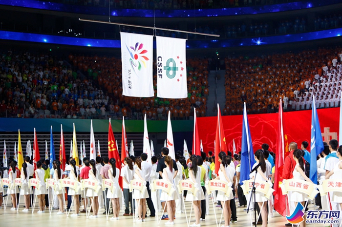 2014年7月28日晚的黄浦江畔,见证了一场青春的聚会。当晚,中华人民共和国第十二届学生运动会开幕式在上海东方体育中心精彩上演。一张张热情洋溢的脸庞、一次次超越自我的努力,以运动为名,以阳光塑心,身体与心灵都奔跑在追逐梦想的道路上。(图为:全国学生运动会会旗、中国中学生体育协会会旗升起)