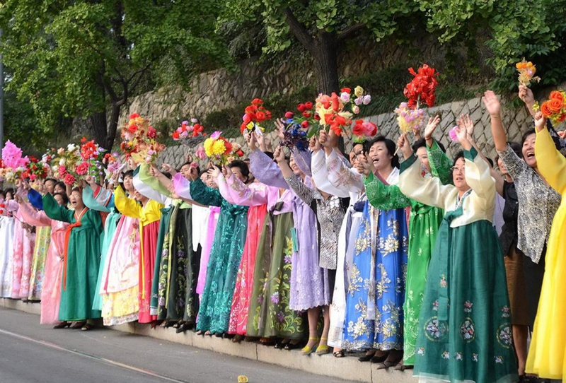 朝鲜民众身着传统服装,手捧鲜花,夹道欢迎。