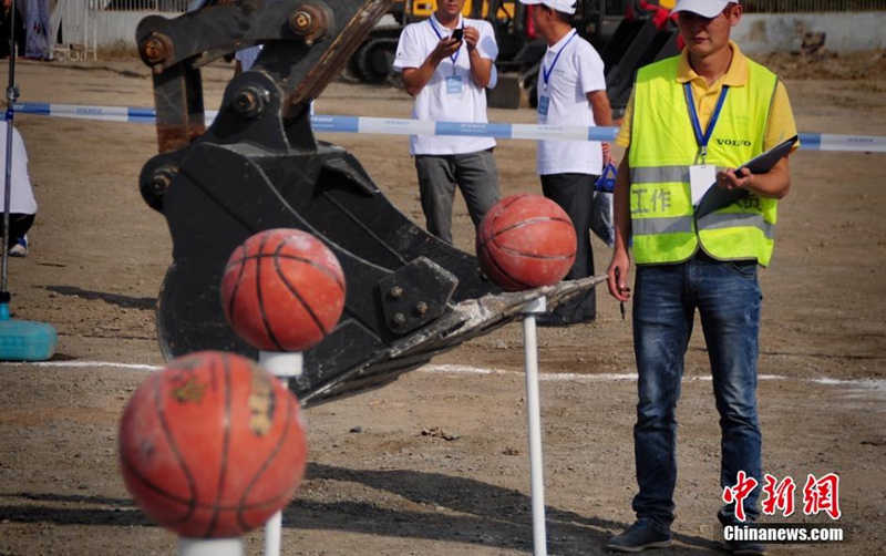 9月28日,“第四届沃尔沃掘战达人赛”在乌鲁木齐开赛。比赛有两大项目,一是参赛者用挖掘机的“爪子”将架子上的球取下,并装入“爪子”,再将球放在球门的斜前方,摆动“爪子”将球打进球门;第二大项目是参赛者用挖掘机“爪子”上的挂钩将方铁块勾起,然后将铁块准确放入方框,完成比赛且用时最短者获胜。图为参赛者用挖掘机“爪子”上的挂钩将方铁块勾起,然后将铁块放入方框。马新龙摄