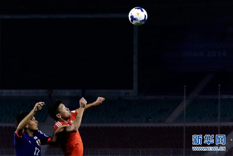 10月9日,中国队球员向柏旭(右)在比赛中拼抢。当日,在缅甸内比都举行的U19亚青赛C组小组赛首场比赛中,中国队以2比1战胜日本队。