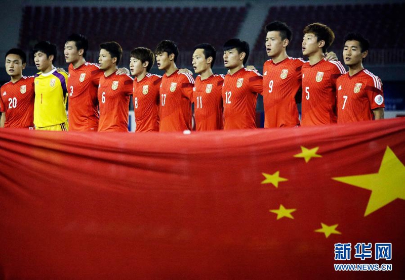 10月9日,中国队球员在赛前唱国歌仪式上。