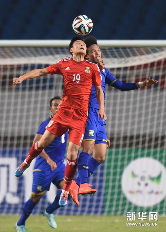 10月10日,中国队球员武磊(前左)在比赛中争顶头球。当日,在武汉体育中心体育场举行的国际足球友谊赛中,中国国家队3-0战胜泰国国家队。
