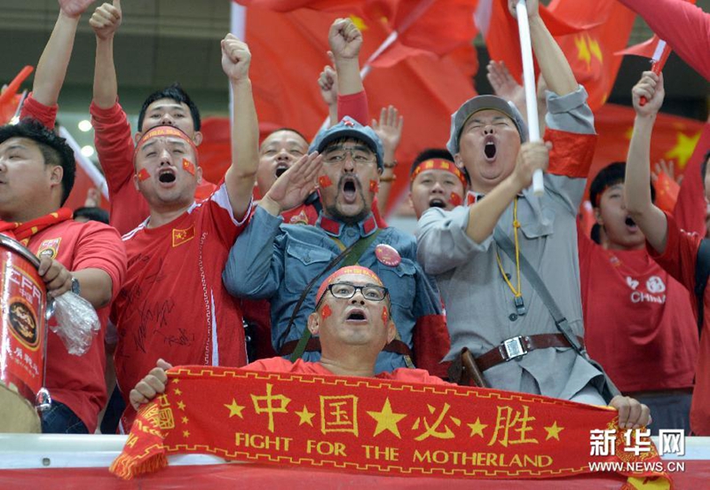 10月10日,中国球迷在比赛中为中国队加油助威。