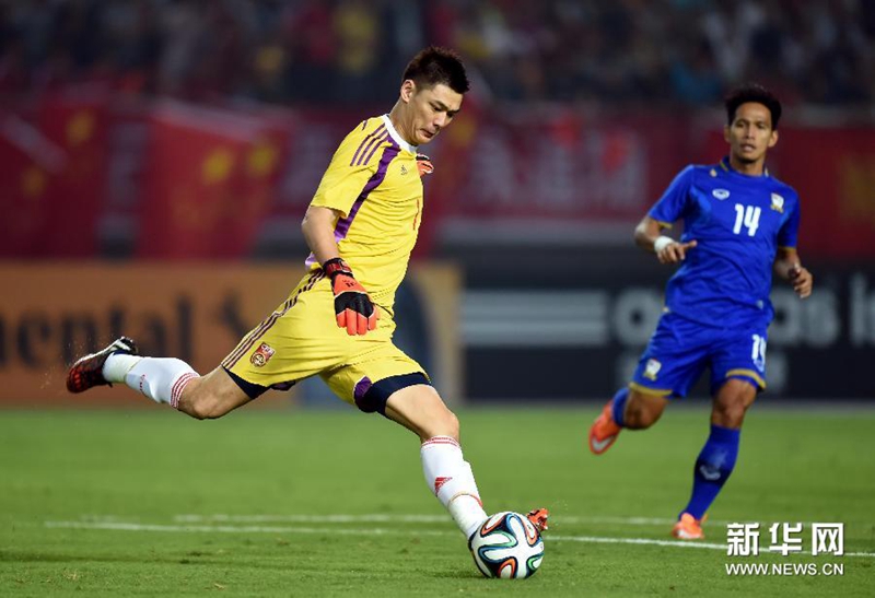 10月10日,中国队守门员曾诚(左)在比赛中。