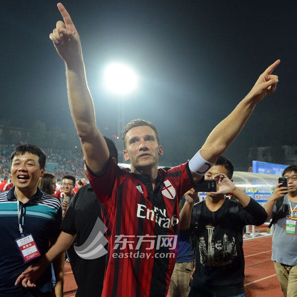 10月11日晚,“荣耀米兰”2014传奇球星中国赛在南京五台山体育场拉开战幕,由巴雷西、马尔蒂尼、舍甫琴科领衔的AC米兰元老队对阵高峰、曹限东、杨晨、邓乐军等组成的北京老男孩队。双方90分钟内战成1比1,高峰和兰蒂格诺蒂分别为球队建功。最终,在点球决战中,老男孩队以4比2胜出。尽管9 月29日刚刚度过自己38岁的生日,但舍甫琴科在场上依旧保持了良好的竞技状态,他的每次拿球都能博得现场球迷的欢呼。赛后,舍瓦绕场一周向球迷致意,嘴里不停地说着Thank You。