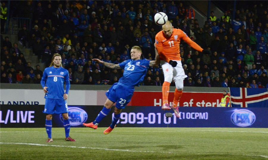 北京时间10月14日凌晨2点45分,欧洲杯预选赛H组的一场首尾对决在雷克雅未克体育场打响,冰岛主场2-0击败荷兰,斯旺西中场西古尔德森梅开二度,冰岛前3场全胜高居榜首,荷兰则是1胜2负,只排在第3位。图为冰岛主场太冷,罗本脚下施展不开只能头球。